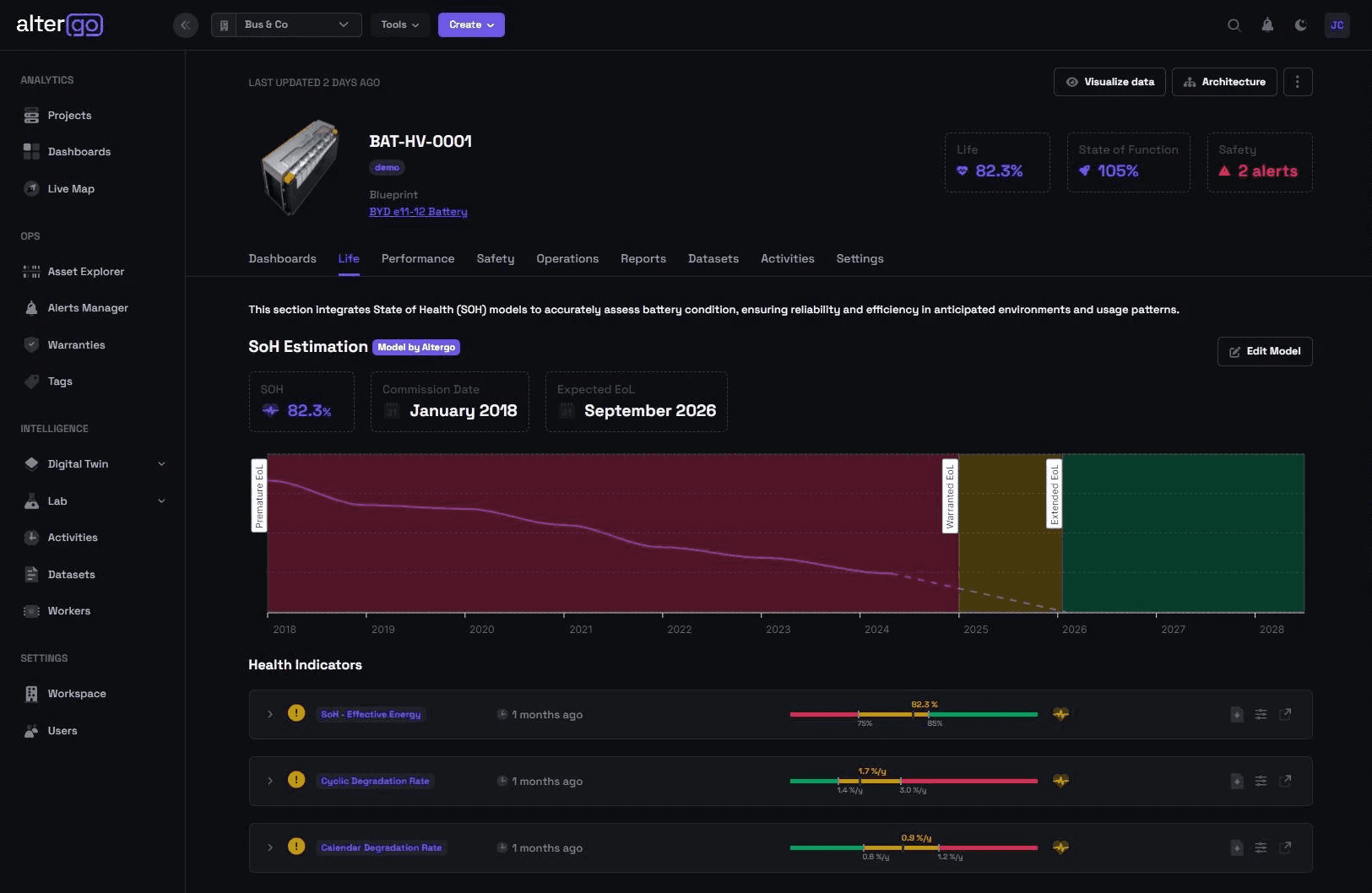 Safety events are the result of slow-moving deviations — impedance growth, plating, thermal gradients — that standard BMS misses until they cross a threshold. Altergo detects these precursors across the fleet and surfaces risk indices with recommended actions, producing evidence-grade outputs for regulators and insurers.